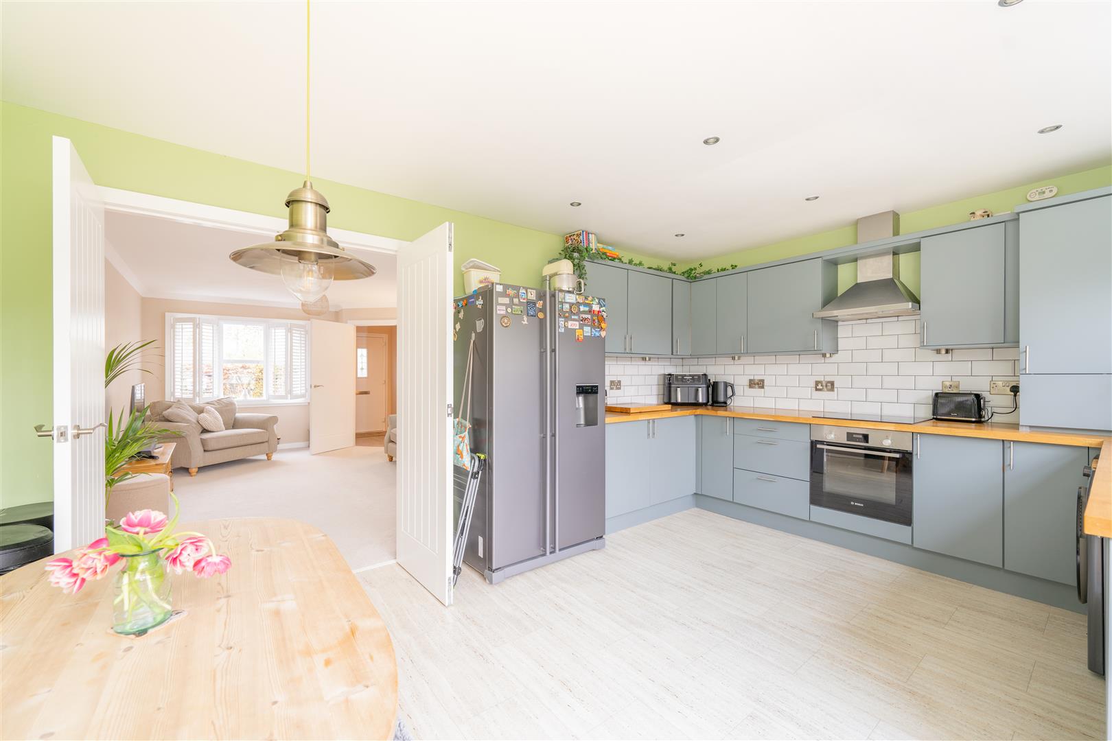 With a leafy frontage set opposite the green, and with ample unrestricted parking available, the property opens to a bright ground floor with a spacious living room styled in neutral tones with bespoke shutter blinds, plenty of space for freestanding furnishings, and a useful walk-in under stair cupboard. The adjoining dining kitchen is modern and streamline, with an excellent selection of cabinetry, integrated appliances and French doors opening to the private garden. Upstairs, a generous master bedroom benefits king sized proportions with a stylish ensuite shower room, with two further bedrooms across the landing and the family bathroom.