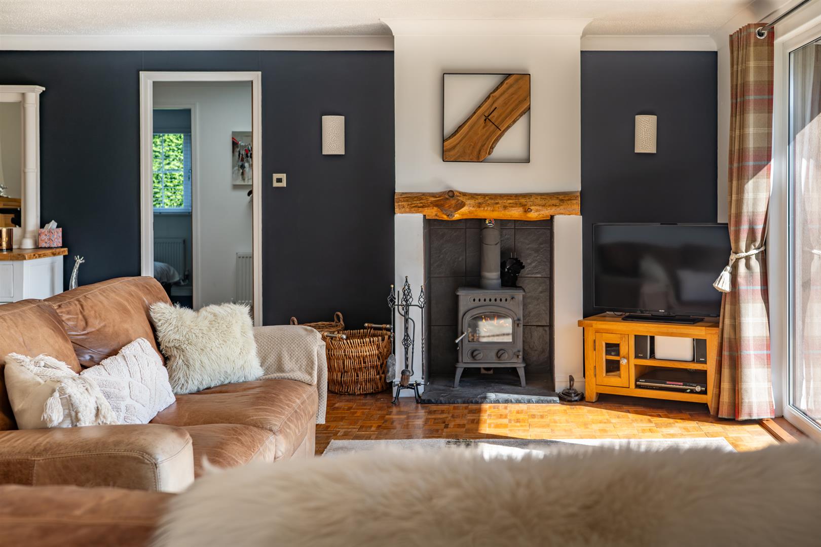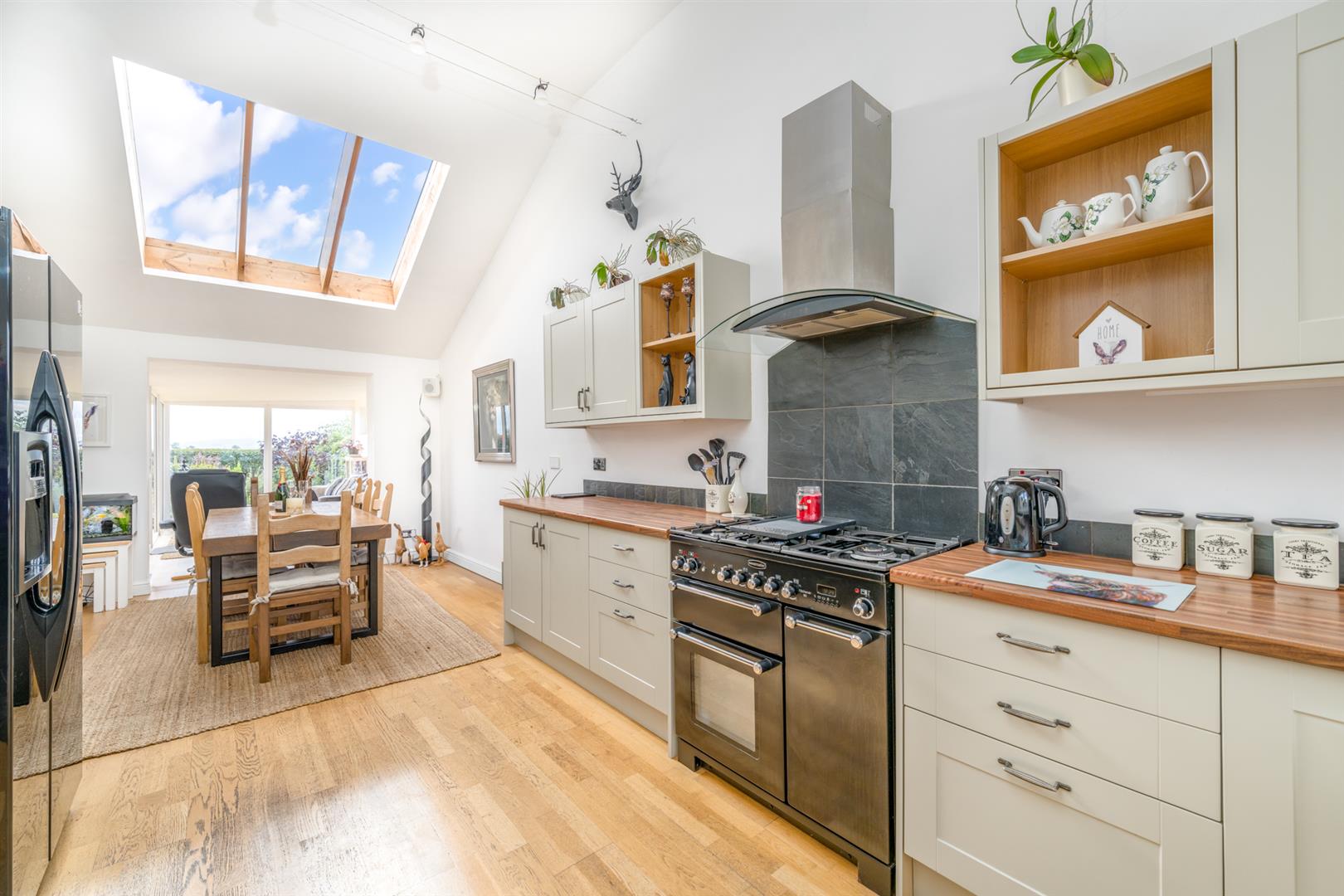 An arched opening leads into the stunning open-plan dining kitchen—a bright and airy space with vaulted ceilings, ideal for both family life and entertaining. The shaker-style kitchen exudes country charm, with sage-green units paired beautifully with oak-effect worktops. A range cooker completes the space, perfectly suited for gatherings with family and friends. From here, the room flows seamlessly into a delightful sunroom, where expansive windows and patio doors provide a picture-perfect outlook over the surrounding gardens.