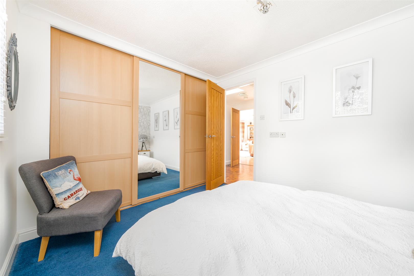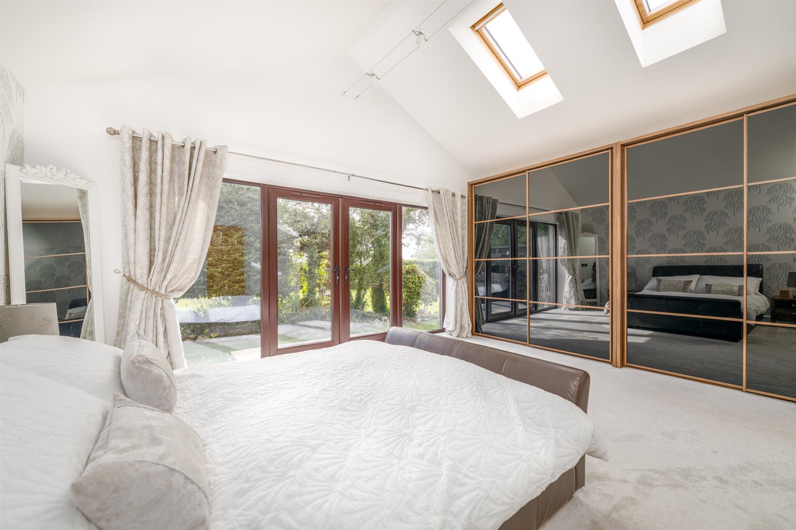The master bedroom is a peaceful retreat, featuring vaulted ceilings, full-height glass doors with garden views, and a private en suite shower room. Two further double bedrooms, both with fitted wardrobes, are complemented by a stylish family bathroom.
