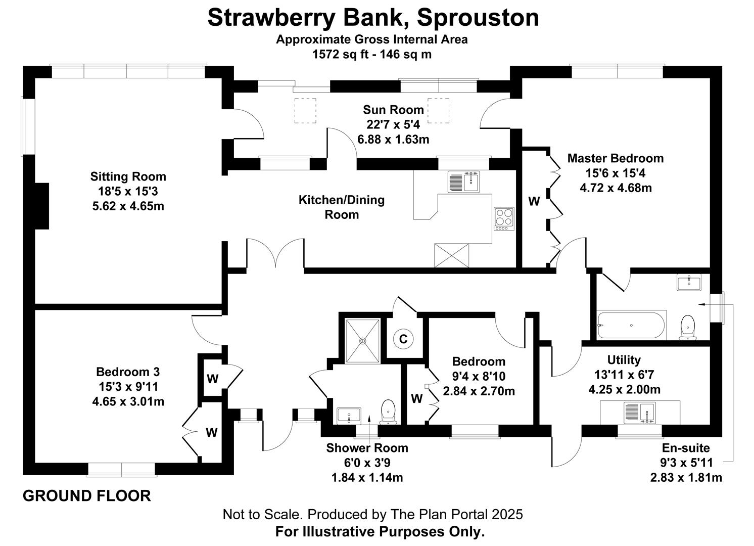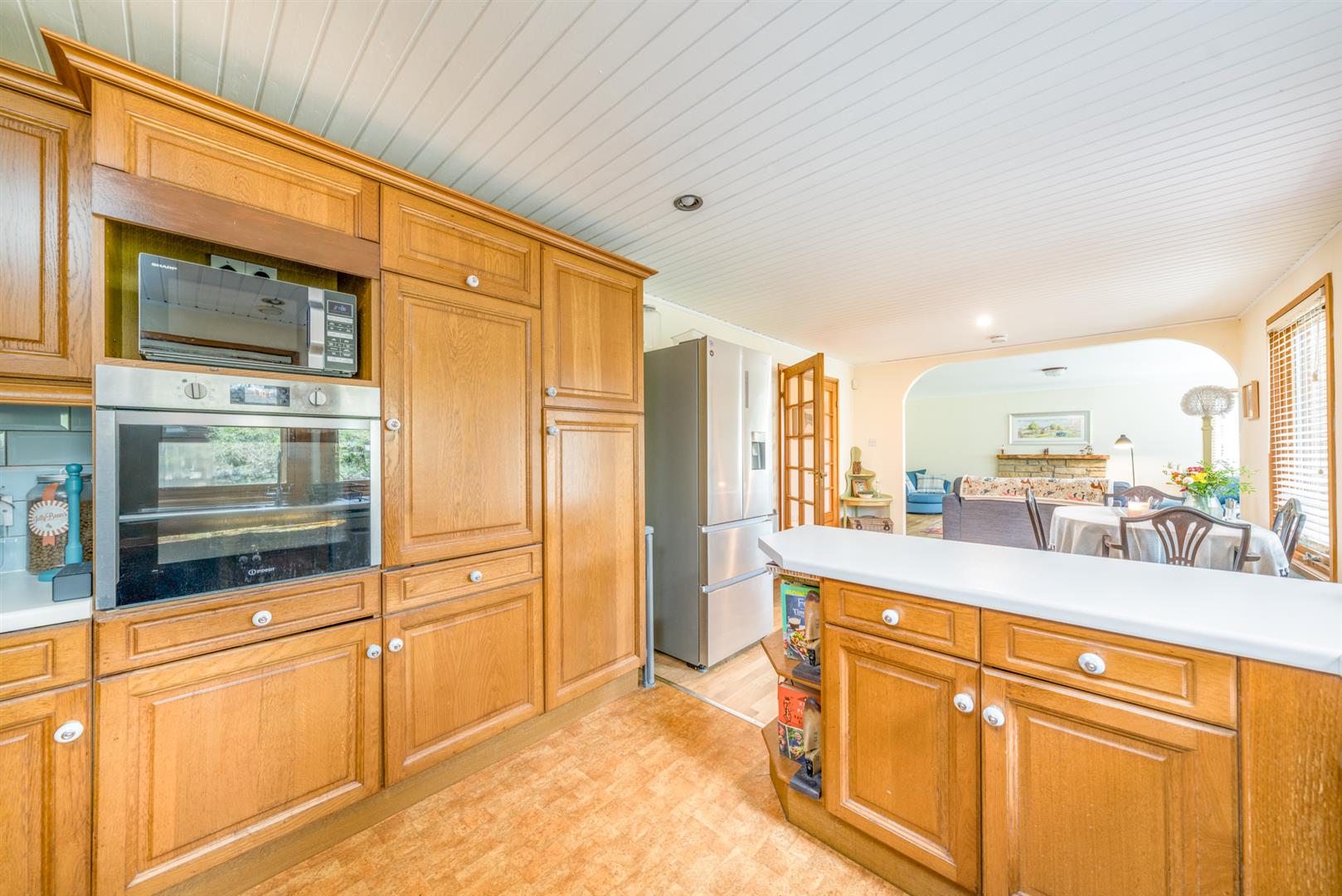 At the heart of the home lies a stunning open-plan kitchen, living, and dining area, showcasing a solid oak fitted kitchen and wood-burning stove creating an inviting central hub ideal for both everyday living and entertaining. A sunroom links the lounge and the master bedroom, bathing the interior in natural light and offering an additional space to relax and unwind.