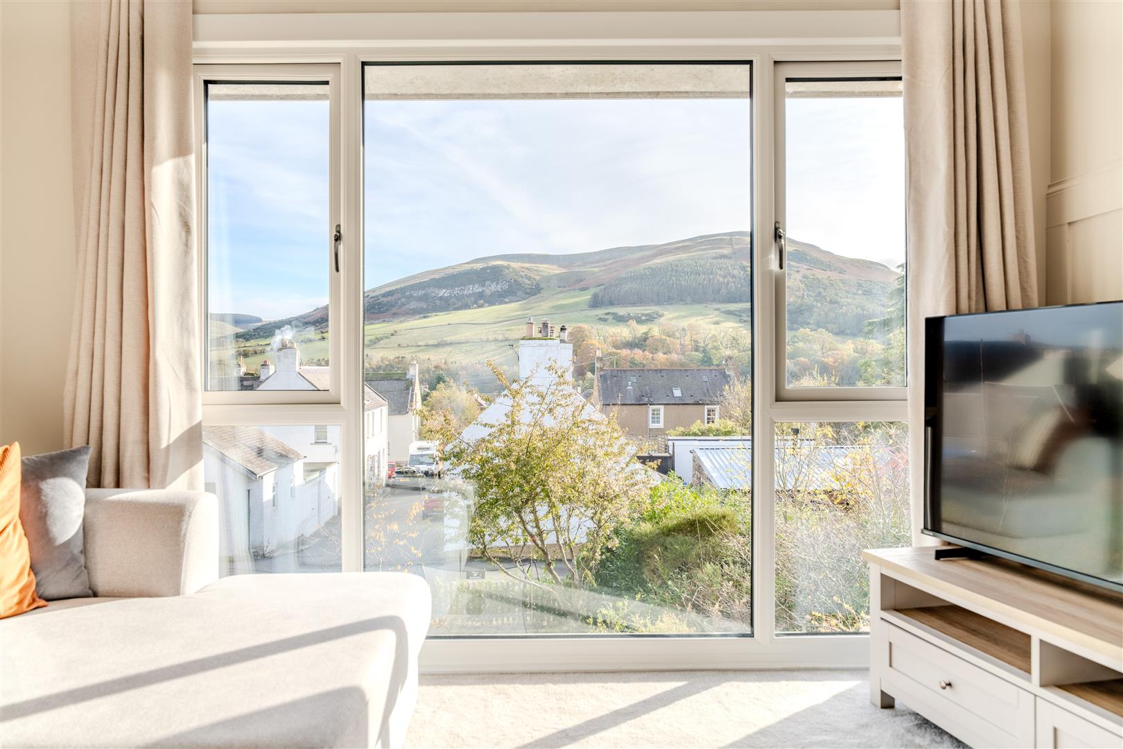 The interiors have been finished to show-home standard, combining elegant décor, thoughtful design, and a calm, modern aesthetic. The sleek, contemporary kitchen perfectly complements the home’s sophisticated feel, while the bright and spacious lounge on the first floor enjoys breathtaking panoramic views of the Cheviot Hills — a truly special outlook that changes beautifully with the seasons. A charming wood-burning stove creates a welcoming focal point, ideal for cosy evenings.