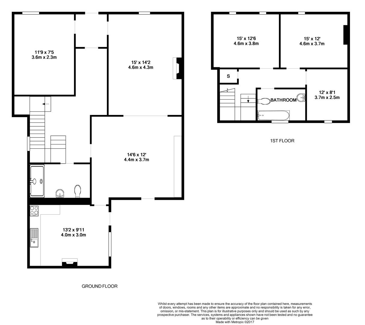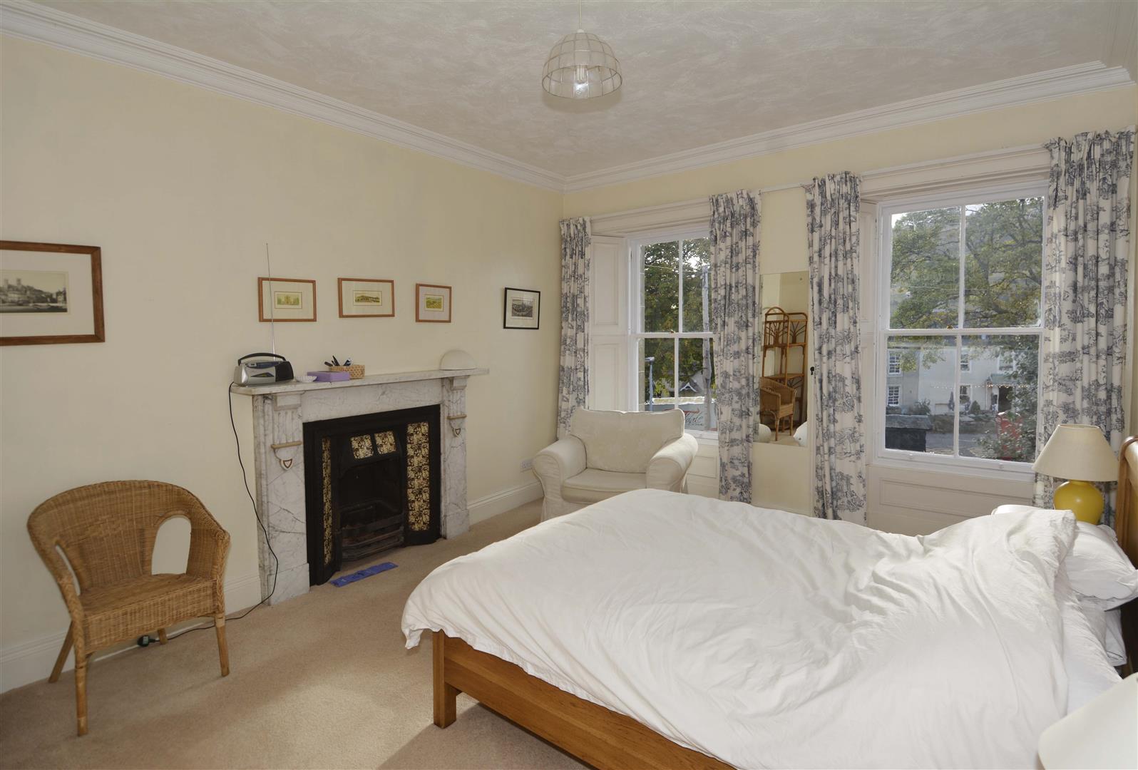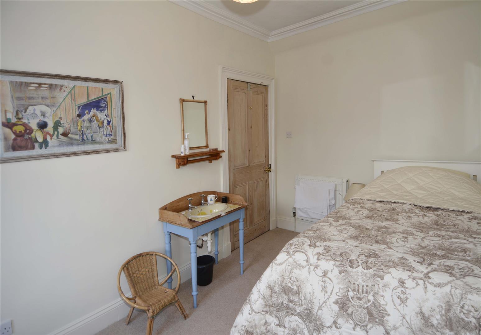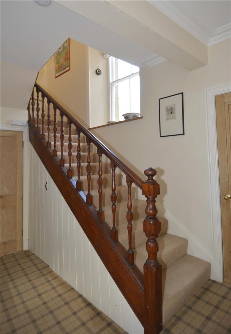 Upstairs a generous landing leads to three bedrooms and a family bathroom. The principal bedroom is a bright spacious room with views to Staerough and features a lovely decorative marble fireplace. The second double also includes a decorative fireplace, while the third overlooks the courtyard to the rear. The bathroom has a bath, WC, and vanity basin with tiled shelving.