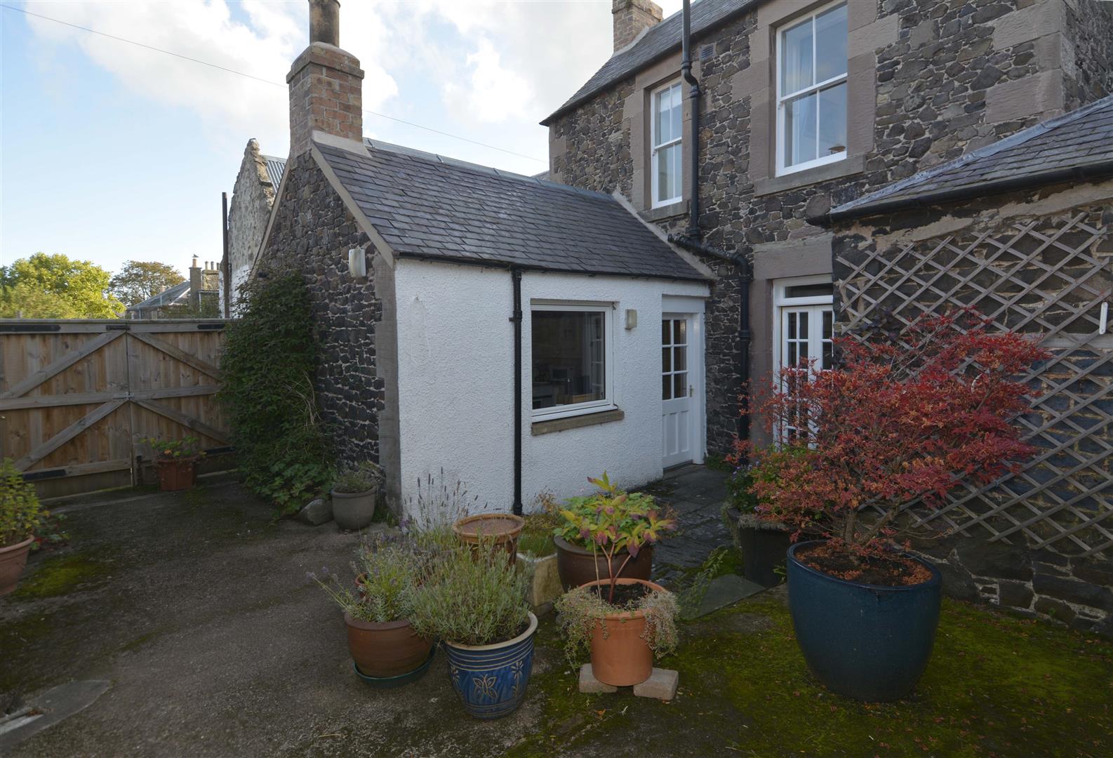 This charming village property blends period character with stunning views to the Cheviots and Staerough Hill. A timber-panelled door opens to a bright hall with traditional stripped doors. To the front are is the living room with large sash and case window and working shutters and features a marble fireplace with woodturning stove, the livingroom opens into the dining room with French doors to the courtyard garden. There is a further bedroom/office to the front. The kitchen is fitted with a range of base and wall units and includes a decorative traditional cast iron range and access to the courtyard. There is a useful downstairs WC and shower room.
