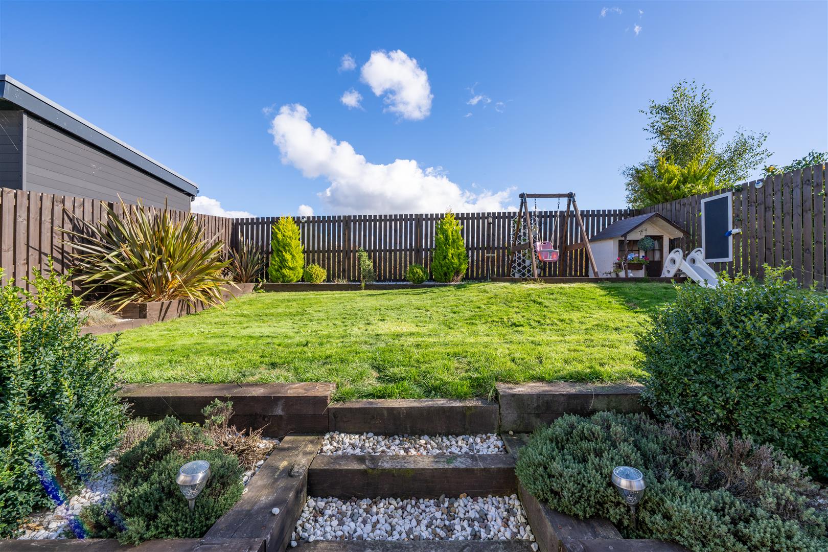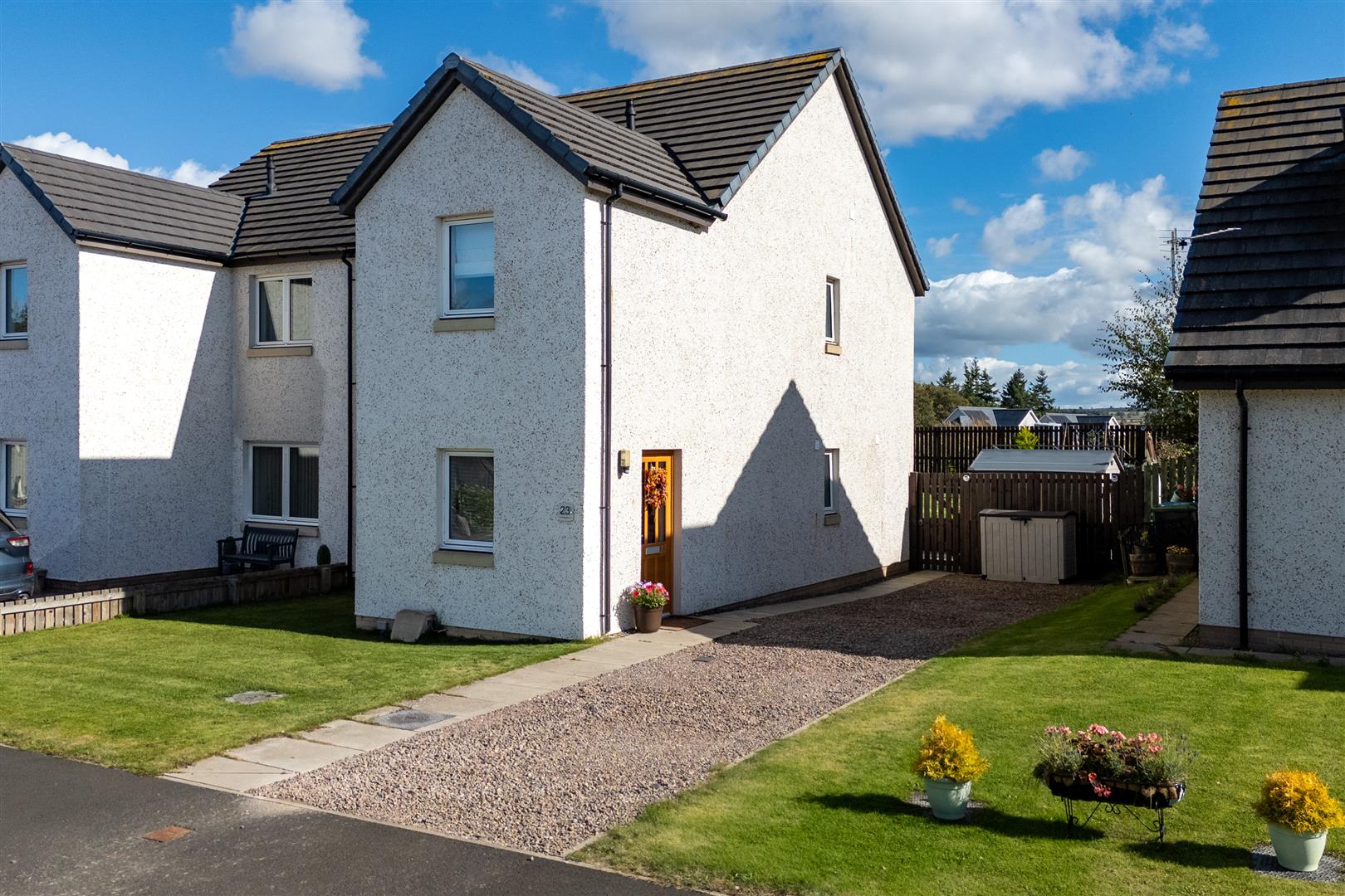 by a neatly landscaped front garden and a driveway with parking for